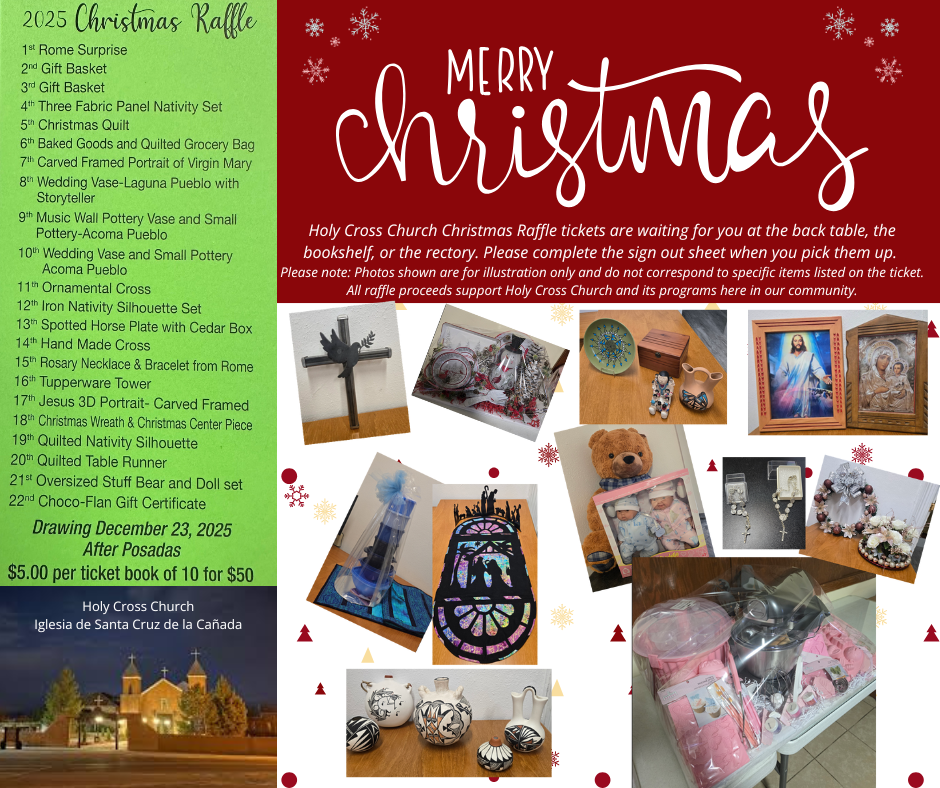 Tickets are available at the back table of the church, the bookshelf, and the rectory. Please remember to complete the sign-out sheet when you pick them up. Drawing will take place on December 23, 2025, after Posadas.